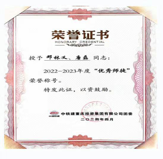 4月29日,在中鐵建重慶投資集團(tuán)召開“導(dǎo)師帶徒”活動總結(jié)表彰大會上,中鐵建重慶軌道交通15號線二期總承包部工程管理部經(jīng)理鄧林義,部員唐磊榮獲2022--2023年度“優(yōu)秀師徒”榮譽稱號,這是對師徒取得成果的肯定,也是對師徒的鼓勵。