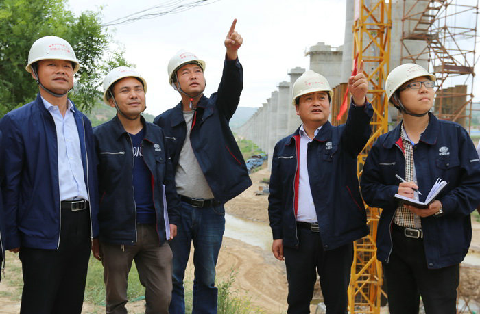 胡湛(左三)在工地向副總經(jīng)理張驊(左一)介紹大橋施工情況 新的時(shí)代,新的征程。如今,刀光劍影已不復(fù)存在,唯有建設(shè)者們奮力拼搏的身影。在銀西高鐵建設(shè)中,胡湛被公司任命為銀西鐵路5標(biāo)一工區(qū)常務(wù)副經(jīng)理,在高速鐵路工地續(xù)寫他的筑路夢(mèng)想。在公司副總經(jīng)理張驊的帶領(lǐng)下,胡湛沖鋒陷陣,在大西北的黃土地上,縱情揮灑筑路激情,用拼搏的汗水,取得了輝煌的勝利。