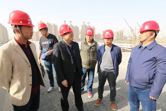 胡湛(左一)和項(xiàng)目班子成員與上級(jí)領(lǐng)導(dǎo)檢查工地 雁白黃河大橋全長(zhǎng)4034.26米,橋面寬度35米,跨黃河主橋?yàn)?45米,跨徑165米,主橋一跨飛越黃河,為黃河上第一大跨度預(yù)應(yīng)力混凝土連續(xù)梁橋,在全國(guó)同類型橋梁中排在前五位,在國(guó)內(nèi)市政工程大橋中排名第一。由于北岸與南岸高差達(dá)133米,主橋越過北岸后,經(jīng)過“兩穿”、“兩跨”、“兩繞”、“兩銜接”,以螺旋式展線爬升往北延伸。在黃河上建橋,其技術(shù)含量和施工難度遠(yuǎn)遠(yuǎn)超過一般橋梁。