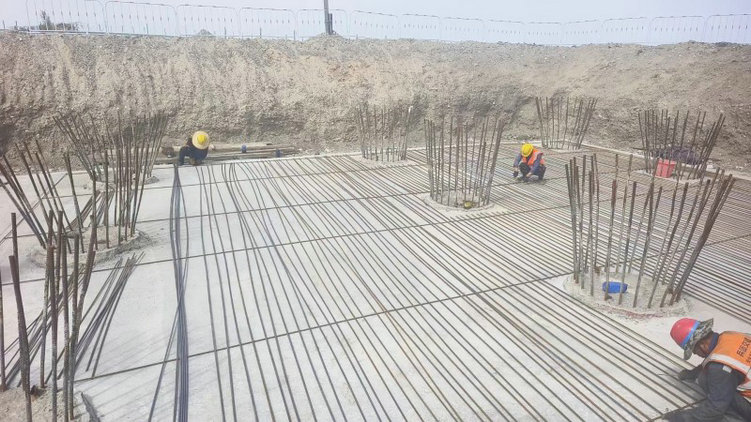 圖為新疆兵團(tuán)建工水電集團(tuán)市政路橋公司第五師雙河市G577沙山子-G219線公路(互通立交工程)RA匝道K0+475.756大橋0#橋臺(tái),承臺(tái)底層鋼筋網(wǎng)片綁扎。(王小丫 攝)