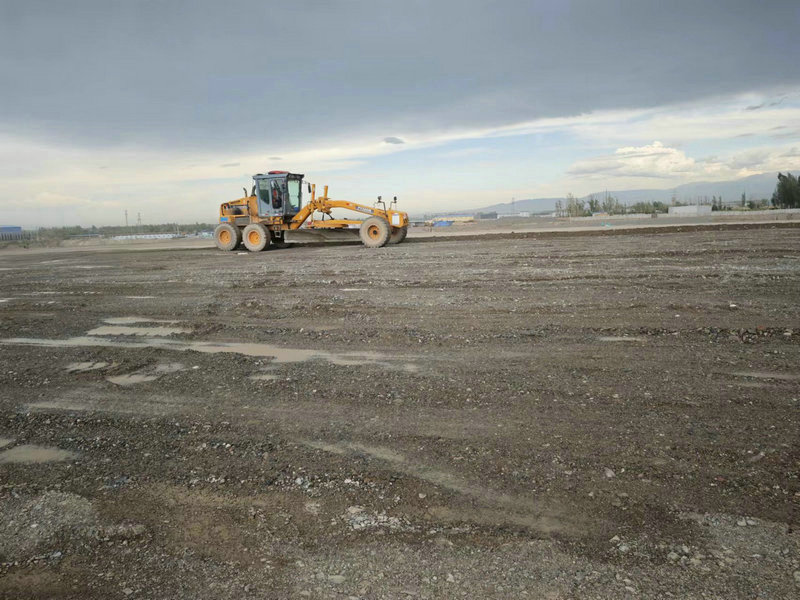圖為新疆兵團(tuán)建工水電集團(tuán)市政路橋公司第五師雙河市G577沙山子-G219線公路(互通立交工程)RAK0+960-RAK0+800平地機(jī)整平。(王小丫 攝)