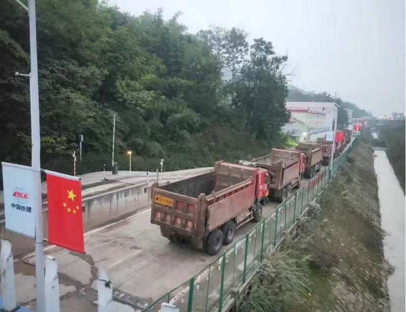 國(guó)慶期間,中梁山隧道進(jìn)口施工便道運(yùn)輸棄渣的車(chē)隊(duì)成河,在施工便道國(guó)旗的輝映下,襯托出濃郁的國(guó)慶的氣氛。