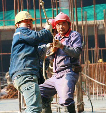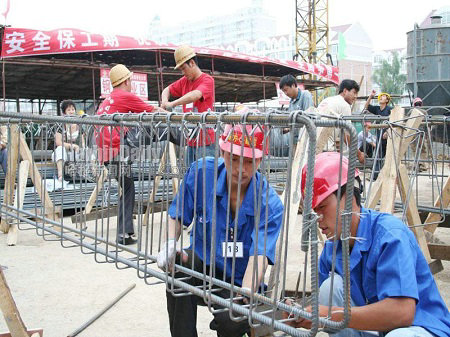 結(jié)合,才使我國經(jīng)濟走上了快速發(fā)展之路,也是“尊重勞動、尊重知識、尊重人才、尊重創(chuàng)造”的精神所在和實質(zhì)表現(xiàn)。如今就有不少農(nóng)民工自豪地說:“只要掌握技術(shù),有絕活兒,就不愁沒活兒干。”在我們項目上有位叫彭兆陽的農(nóng)民工師傅說:“我從十七歲開始學(xué)習(xí)電工電焊,開鉆機和機械修理,快二十年了,一個月掙四五千元很正常,干得好老板還會漲點工資,年底另有獎金。”下面是筆者無意間從佛山市華陽特大橋建設(shè)工地上,用數(shù)碼相機拍攝到的農(nóng)民工工作照,你能說這些農(nóng)民工兄弟不是人才嗎?