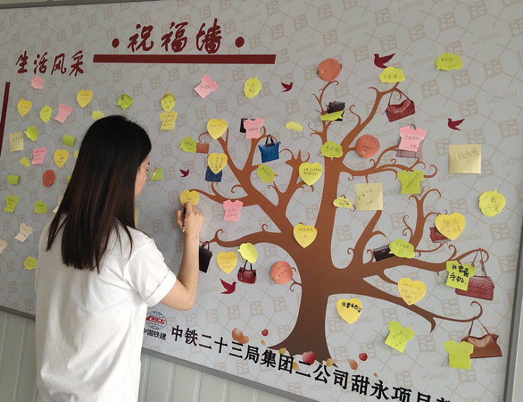 “祝中鐵二十三局集團(tuán)蒸蒸日上,祝甜永項(xiàng)目越來越好,祝父母孩子健康快樂,祝同事工作順利、平安幸福,祝好人一生平安,祝我有個(gè)瘋狂快樂的假期游,希望我快快變瘦!生活再難也要記得微笑面對哦……”這是中鐵二十三局二公司甜永項(xiàng)目部員工風(fēng)采寄語墻上的員工留言。每每員工排隊(duì)打飯期間,會不約而同將視覺鎖定在祝福語展板上。仔細(xì)看五顏六色、形狀各異的可愛粘貼紙像豐盛果實(shí)掛滿大樹。這些承載員工大到對企業(yè)的祝福,小到對自己生活的許愿,把項(xiàng)目團(tuán)隊(duì)的正能量,員工對遠(yuǎn)離家鄉(xiāng)溫情的惦念、大家充滿激情的青春夢想體現(xiàn)的淋漓盡致,表現(xiàn)出項(xiàng)目大家庭里每個(gè)成員都有積極向上、陽光進(jìn)取的心態(tài)。
