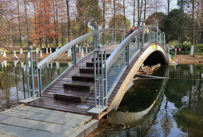 視,荷葉連田田,有幾朵粉粉的荷花亭亭玉立在荷葉上,有著少女般楚楚動人的模樣。這個石拱橋與荷池珠聯璧合,真是讓人怦然心動、回味無窮。轉眼已入深秋,一個陽光和美的午后,我走進了鄞州公園,焦糖色的童話森林別有一種意境。一座不銹鋼欄桿,透明玻璃橋身的拱形小橋典雅中透著時尚浪漫,她連接了兩端美麗的水杉林。落地垂針仍獻毯,穿林曲水可流觴。紅杉、小橋、假山,構成了一副美麗的山水油畫。走著走著冬天已來臨,雖是12月下旬,月湖公園尚未完全退掉秋日的斑斕,黃綠橘的色調依稀可見。落日下一座小橋靜靜的浮在湖上,橋頭岸邊一顆老樹枝丫斜在水面上,讓我頓時想起疏影橫斜水清淺,暗香浮動月黃昏的美妙詩句,這直叫人感嘆古人創(chuàng)作的意境之美。這些橋只是寧波各大公園上百座橋的一部分,我還游覽了其他公園,像院士公園的院士橋,古塘公園的古橋等等,他們都很精致,各有各的特點。這些橋已打開了我認識寧波的一扇窗口。用心留意身邊的每一個事物,都會有收獲。