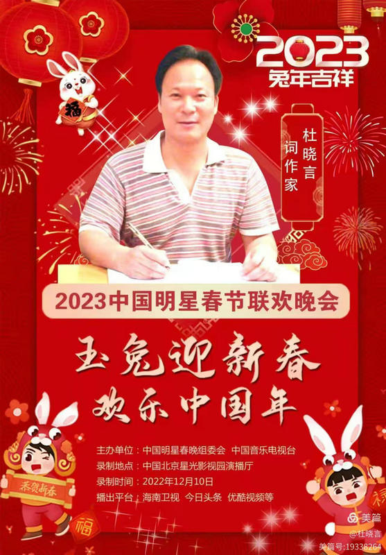 杜效言(杜曉言),軍旅詩詞、散文作家,新聞工作者,騰訊音樂人,中國音樂著作權(quán)協(xié)會會員,中國職工音樂家協(xié)會會員,中國職工攝影家協(xié)會會員,鐵路工程建設(shè)網(wǎng)通訊員。傳略收入《鄆城名人大詞典》《詞曲中國藝術(shù)人才庫》等。1962年11月山東鄆城生人?,F(xiàn)定居濟(jì)寧市。1981年10月參加鐵道兵,1984年1月隨鐵道兵集體兵轉(zhuǎn)工。迄今在央視、省市級電視臺演唱作詞歌曲20余首。在省部級以上刊物發(fā)表歌詞500余首。多首作詞歌曲在社會廣泛流傳,獲改編并獲獎。著有多部歌詞集。