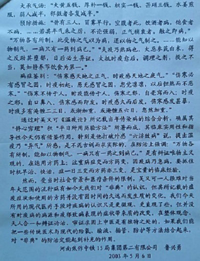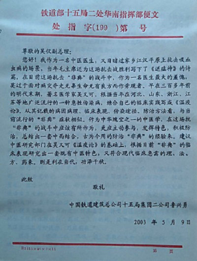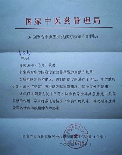 我作為一名基層中醫(yī)醫(yī)生,雖然不能直接參與到抗擊“非典”的一線,但也可以向當(dāng)時的衛(wèi)生行政部門領(lǐng)導(dǎo)提出建議與獻方獻策,于是便向吳儀副總理寫了這封建議信與附件。隨后由國家中醫(yī)藥管理局和中國中醫(yī)研究院給予了回復(fù)。