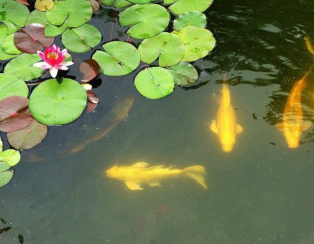 游魚水中戲,花艷如色染。