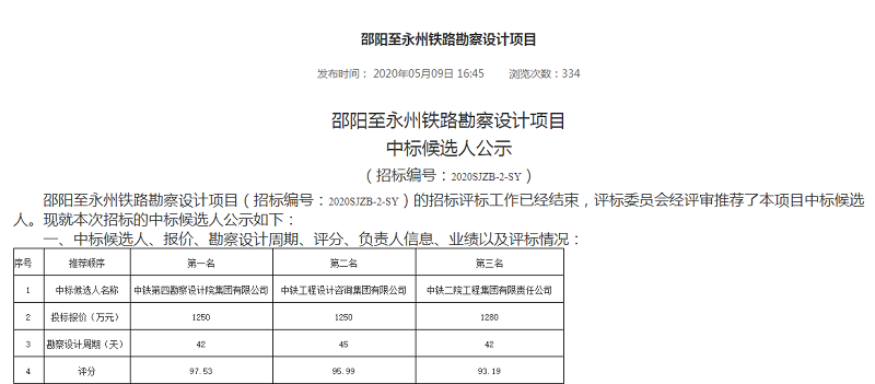 呼南高鐵通道·邵陽至永州鐵路勘察設(shè)計(jì)項(xiàng)目中標(biāo)結(jié)果