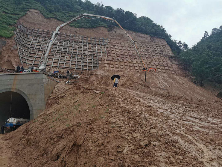 高樓塬隧道施工已接近尾聲,現(xiàn)已進(jìn)行的是隧道進(jìn)口框架梁及邊坡養(yǎng)護(hù)施工。而高樓塬隧道地處溝壑區(qū),地形復(fù)雜,與地面高低落差大,加之塬邊溝壑地質(zhì)發(fā)育不良,溝壑兩側(cè)坡面土質(zhì)松散,一旦遇上持續(xù)降雨就會(huì)出現(xiàn)水土流失、滑坡、甚至排水溝斷裂,骨架護(hù)坡坍塌等嚴(yán)重現(xiàn)象。