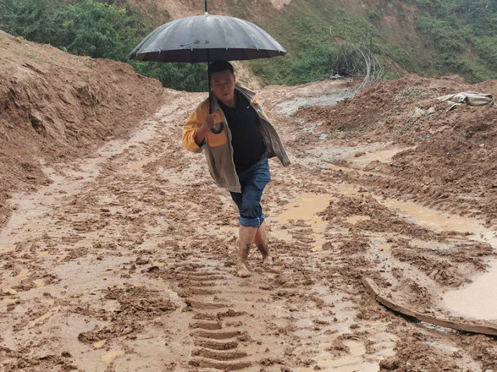 張志和在泥濘的施工便道上險(xiǎn)些滑倒