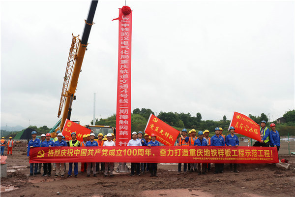 圖:5月15日,重慶軌道交通4號線二期站后系統(tǒng)設(shè)備2標(biāo)成功組立接觸網(wǎng)第一桿。韓秋攝