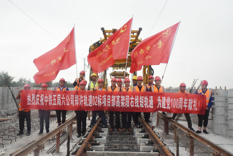 鄭州機場至許昌市域鐵路工程(鄭州段)線路北端起于港區(qū)北站,南端止于鄭州市界,線路全長33.43km,共設(shè)車站16座,其中由中鐵五局六公司承建的軌道安裝工程02標(biāo)段線路全長23.263km,高架段長5km。自2021年3月進入高架段鋪軌施工階段以來,為加快高架段施工進度,全面掀起復(fù)工復(fù)產(chǎn)的大干高潮,中鐵五局六公司鄭許軌道2標(biāo)項目部共開設(shè)了2個鋪軌作業(yè)面,作業(yè)人員達80余人,管理和技術(shù)人員配備齊全;與此同時,項目部積極組織人員去其他標(biāo)段學(xué)習(xí)高架段施工經(jīng)驗,制定高架段施工質(zhì)量控制措施,解決道床裂紋等高架段整體道床施工常見問題,確保工程質(zhì)量。通過管理措施與技術(shù)措施雙管齊下,項目部于5月23日快速、優(yōu)質(zhì)實現(xiàn)了高架段右線短軌通,為接下來實現(xiàn)高架段雙線軌通奠定了堅實基礎(chǔ)。