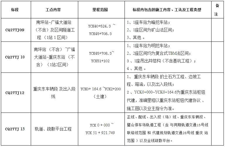 本招標項目里程樁號為:YCK40+524.3~YCK51+102線路長度為10.58km(包括重慶東車輛段及出入段線,南坪站(含)~重慶東站(不含)的區(qū)間工程及車站工程等,對應CQ27TJ09~CQ27TJ13等4個施工標段。