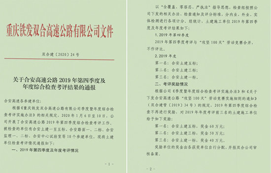 2019年是該項(xiàng)目部攻堅(jiān)之年,合安項(xiàng)目部堅(jiān)持黨建促生產(chǎn),以“黨員質(zhì)量監(jiān)督崗”活動(dòng)為抓手,扎實(shí)推進(jìn)項(xiàng)目標(biāo)準(zhǔn)化建設(shè),成功克服偏遠(yuǎn)山區(qū)等工程建設(shè)區(qū)位劣勢,順利完成了公司和業(yè)主下達(dá)的年度生產(chǎn)目標(biāo),并在安全、質(zhì)量、環(huán)水保等各方面均取得了良好業(yè)績,贏得了業(yè)主的高度認(rèn)可。